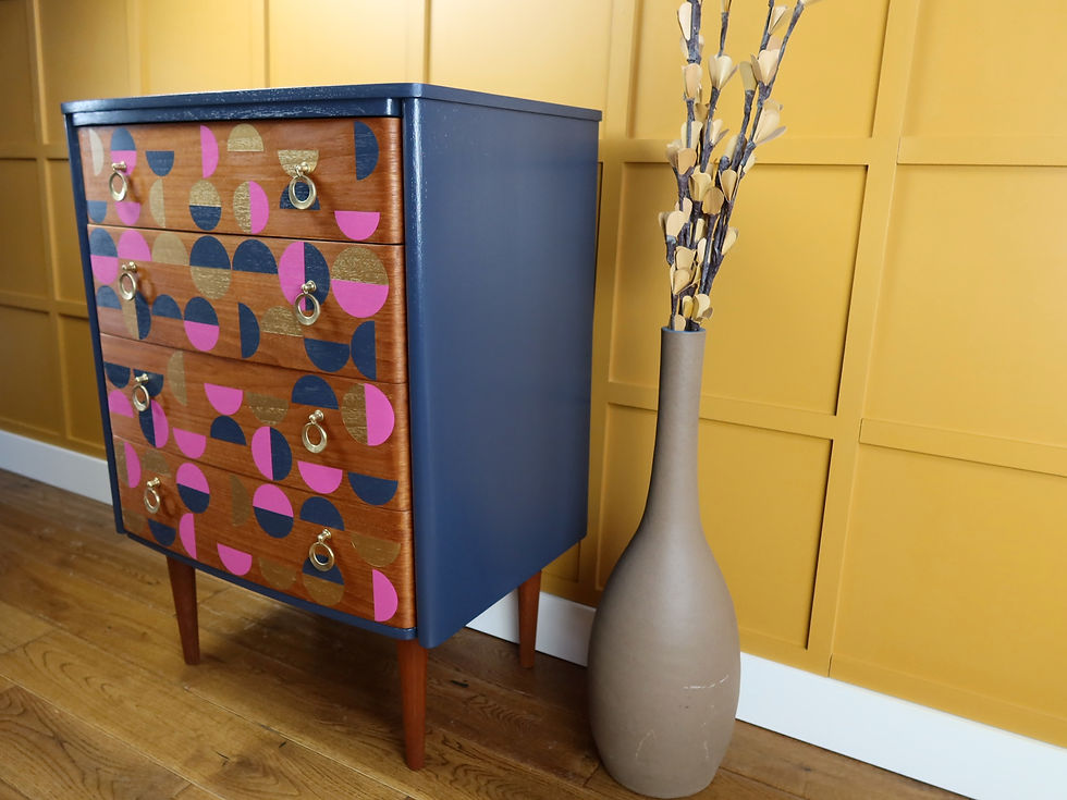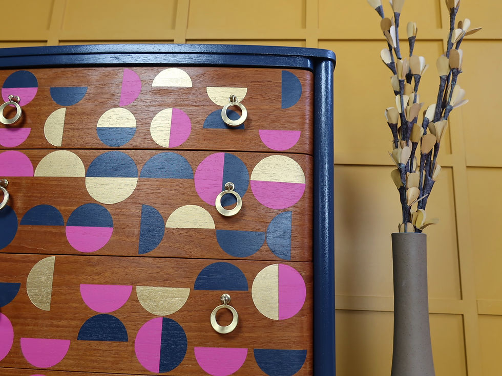 Retro Mid-Century Chest of Drawers with Gold and Copper Geometric Design